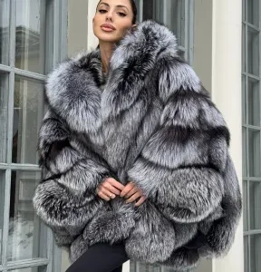 Silver Fox Fur Poncho Coat | Luxurious Hooded Fur Stole | Statement Winter Wrap | Natural Fox Fur Outerwear