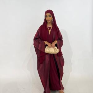 Main Abaya Dress: A flowing, floor-length abaya in deep mulberry hue, featuring elegant draping and thoughtful design details